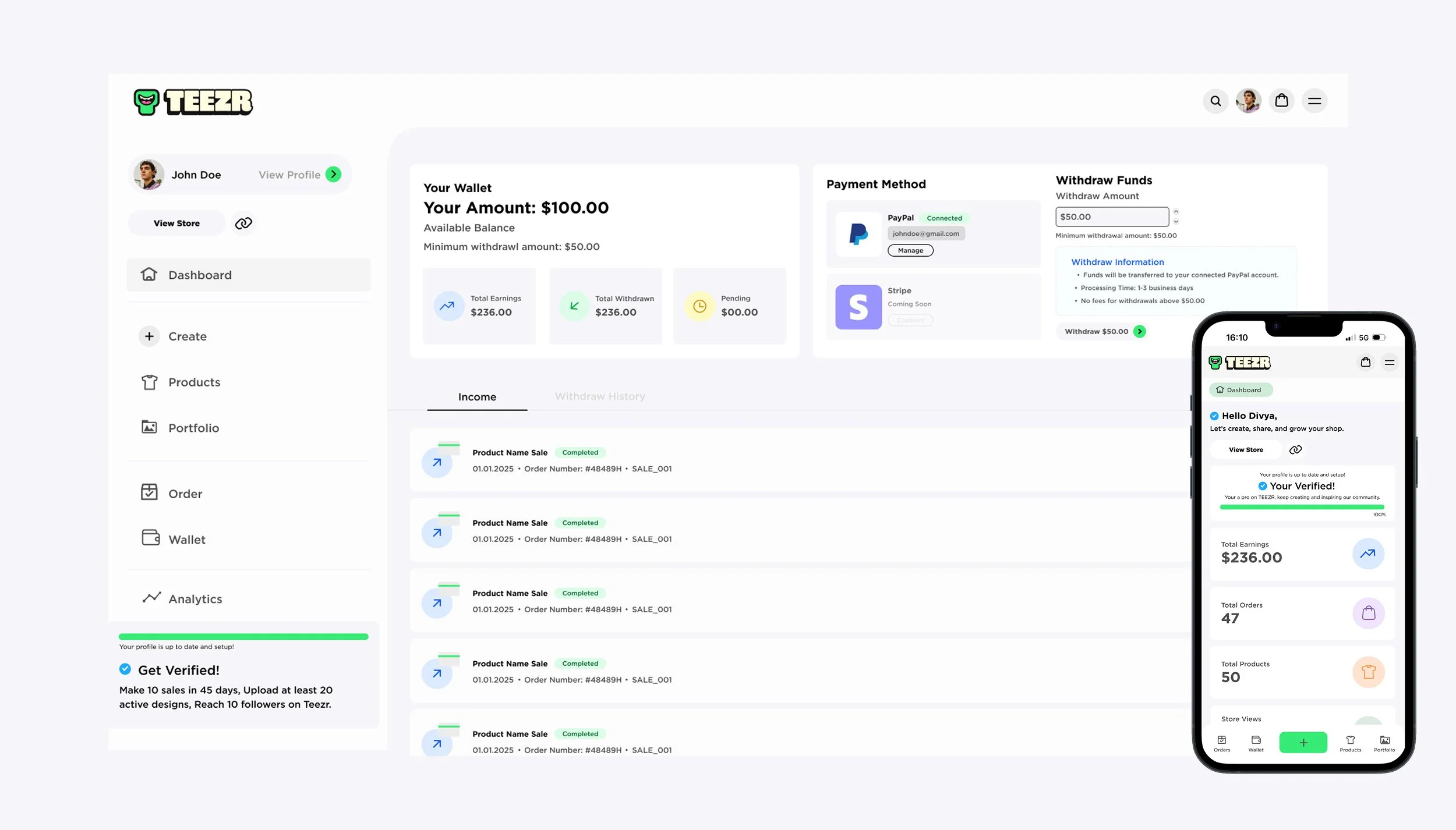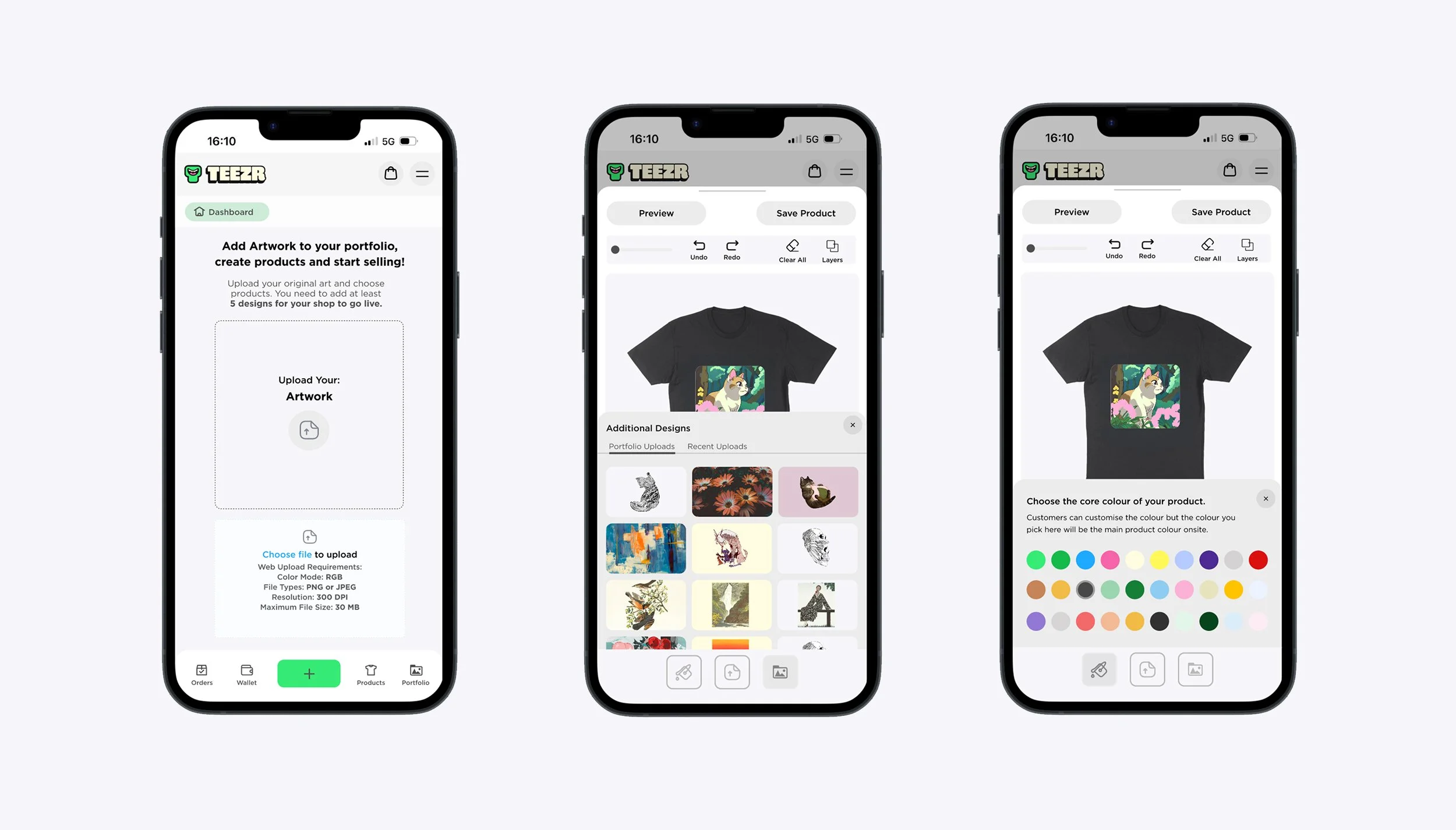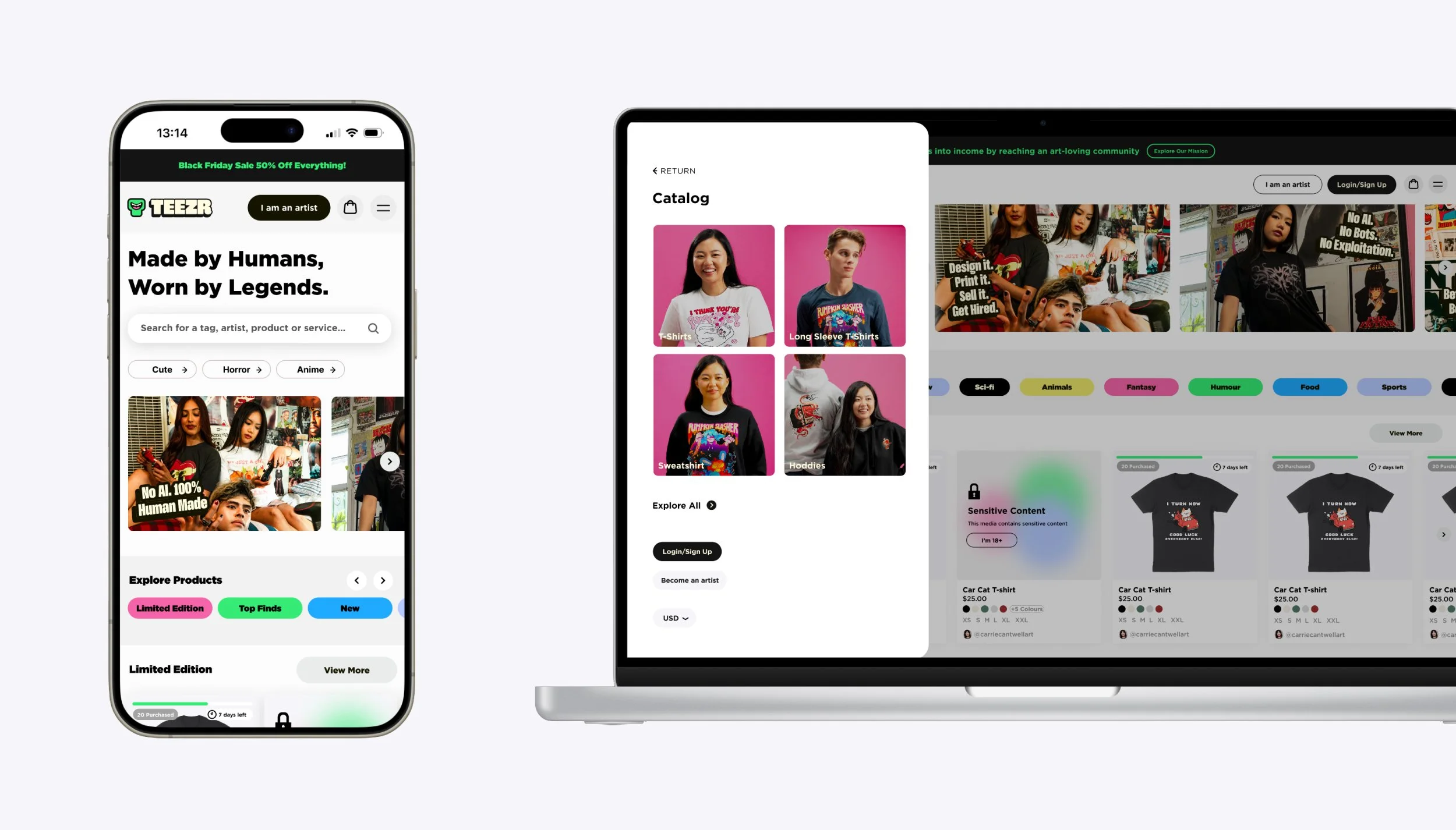 I’m currently leading the replatforming of Teezr, a vibrant and playful NYC-based startup that connects customers directly with artists and creators to make personalized products more accessible. As the head of product design and brand identity, I’m guiding the project through its design phase, shaping a cohesive experience that reflects Teezr’s fun and dynamic ethos.